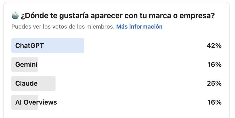 Nosotros lo hemos confirmado en una encuesta reciente en LinkedIn (abril de 2026), donde más 40% reconoce que le gustaría aparecer en ChatGPT como primera opción. Luego, Claude con 25% y más atrás aparece Gemini y AI Overviews.